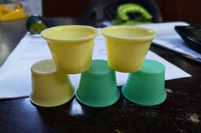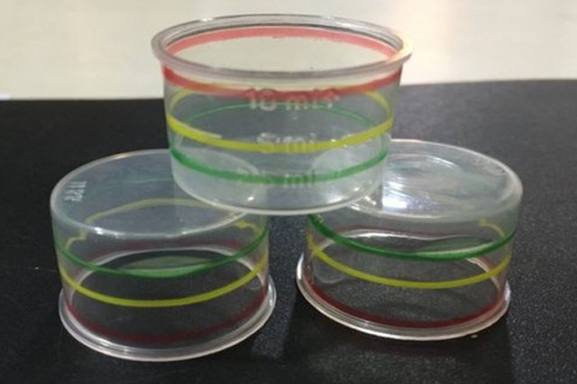 Three color strip printed measuring caps 10ml (25mm) to indicate each volume marking differently. We Manufacture Measuring Caps Of Various Sizes Along With Different Volume Marking & Colours, Inhouse. These Measuring Cups Are Manufactured Using Our Own Top-Quality Moulds & Highly Efficient Moulding Machine.